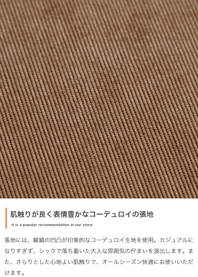 ・コーデュロイの温かみと、天然木の質感が相まって上品な印象。